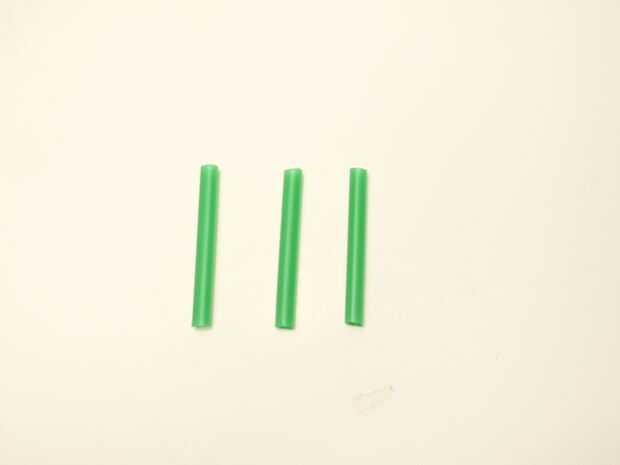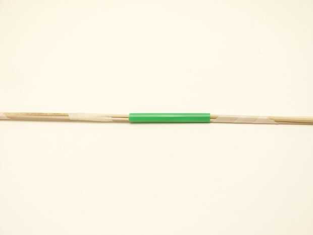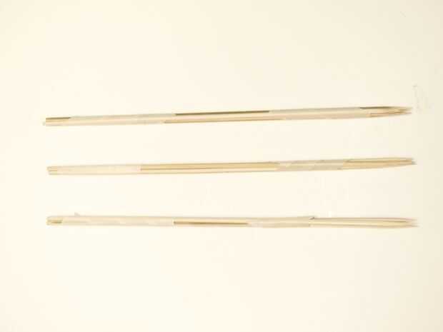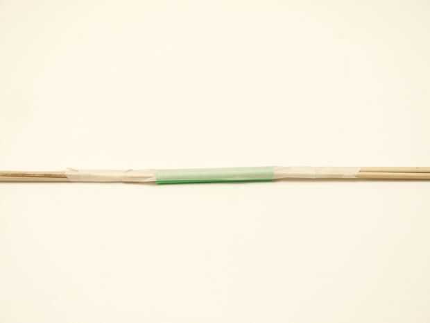Cortar la paja en tres partes iguales. Utilizar los pedazos de paja para conectar juntos los paquetes de la brocheta. Fijarla con cinta.