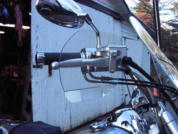El original (versión 1) utiliza un escudo de metal curvo para bloquear el viento. Esto envuelve la parte delantera de cada palanca de agarre y freno/embrague. Sin embargo, el metal estaba buscando grandes y abultados. También creo que el diseño curvo no desviar el viento así como plano escudo.