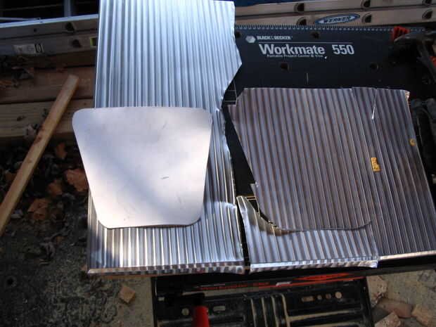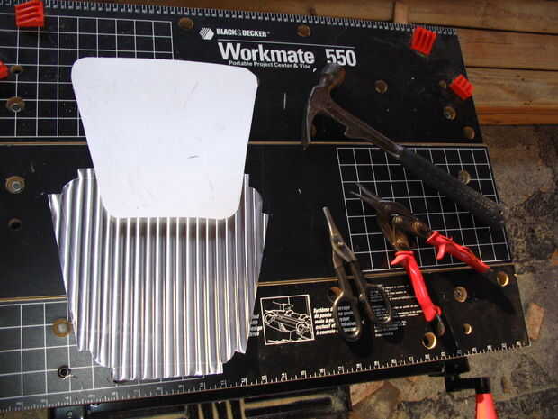 Corte la forma con unas tijeras de chapa, dejando aproximadamente 1/2 extensiones en cada lado. Estas extensiones se dobla sobre para crear un panel rígido. Las esquinas redondeadas no pongo extensiones.