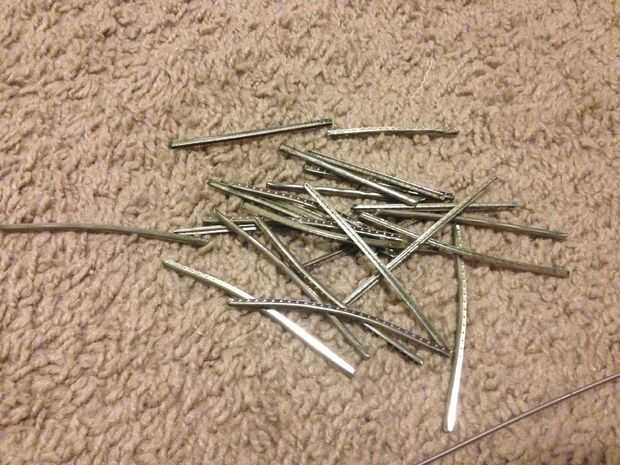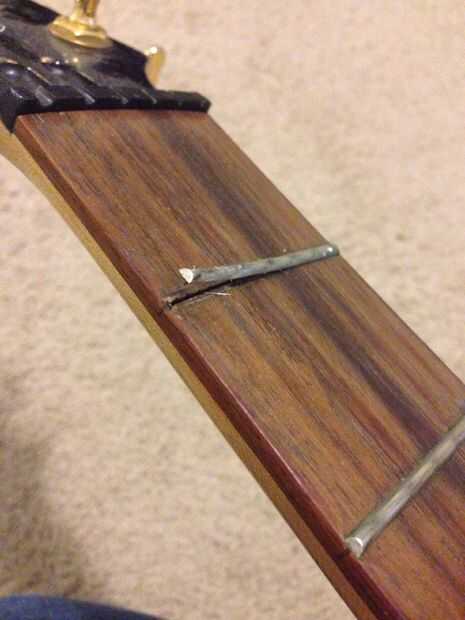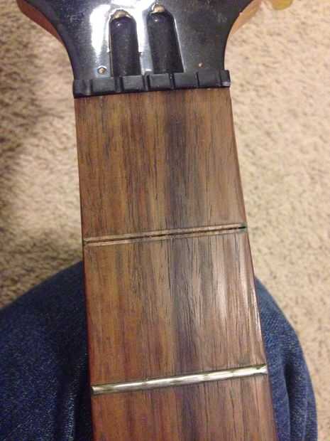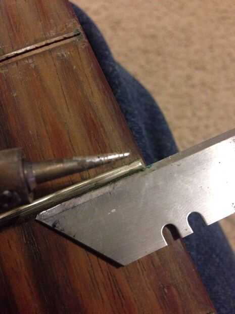 El primer traste me salió muy fácilmente con el cortador de final, pero trastes posteriores eran mucho más difíciles. Terminé usando una hoja de afeitar se deslice bajo el traste y el traste con mi soldador de calefacción. Suave presión hacia arriba con mis dedos pulgar e índice, combinado con el calor, recibirá al final del traste para arriba un par de milímetros del palo de rosa, y luego utilizaría las fresas de extremo para sacar el resto del camino.