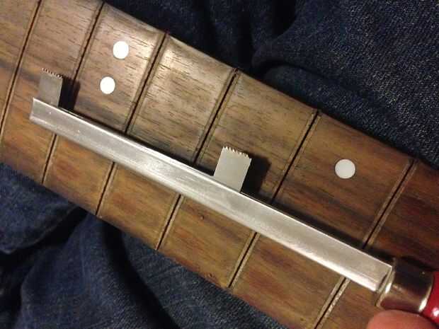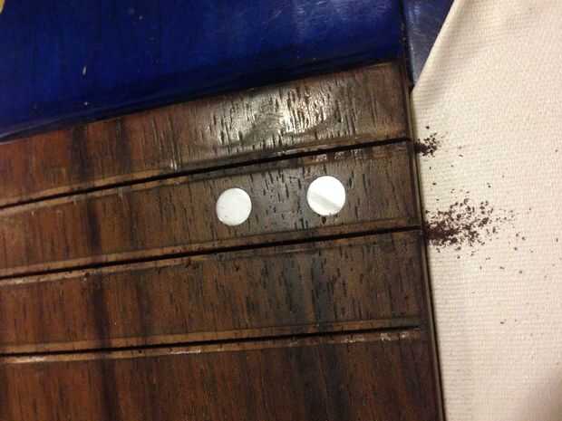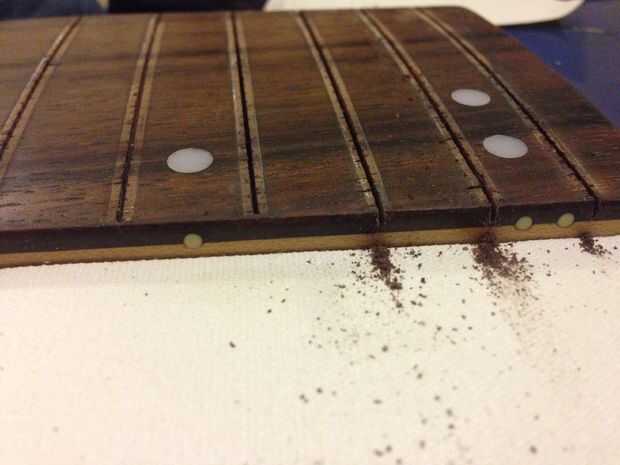 Lo que se decidieron el relleno las ranuras con, usted necesitará limpiarlos hacia fuera, para mejorar la adherencia y uniformidad. Yo también quería tener los bordes visibles--si nos fijamos en la última foto, se dará cuenta de que las ranuras originales (a la izquierda) tiene enlace sobre los lados de la espiga. No un problema cuando tienes un traste grande sentado allí, pero otra vez, quería referencias visuales, así que quería ver el "traste" en el lado de los trastes.