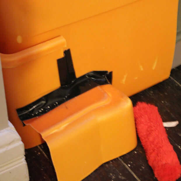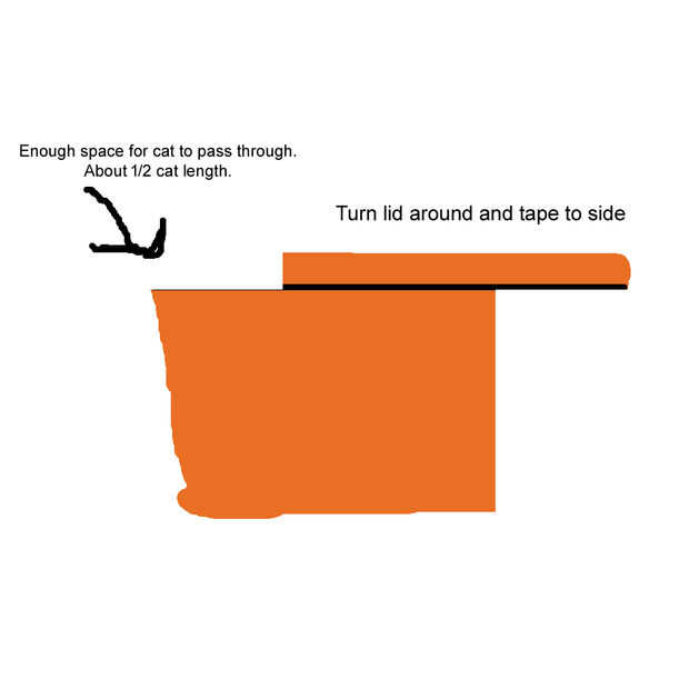 1. vuelta a la tapa y cinta adhesiva en la parte superior, con una brecha lo suficientemente grande como para el gato en.