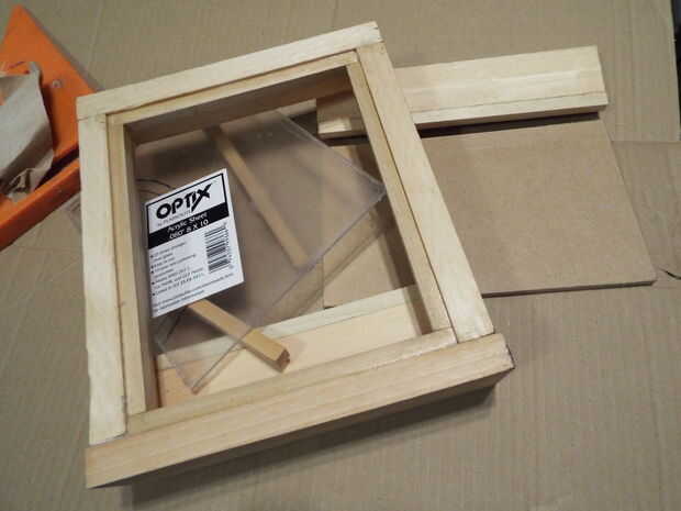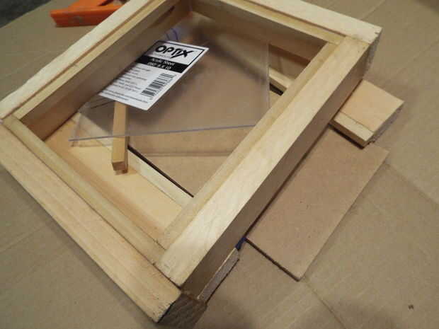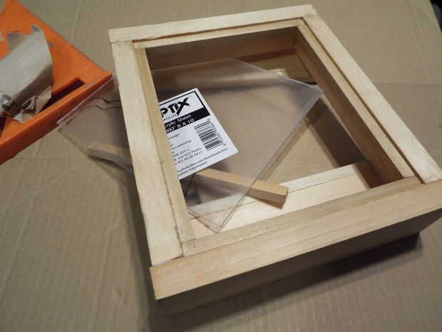 Cuando se tiene un marco de caja construido, cortar las piezas de 1 x 1 para actuar como un marco de parada para el plexiglás que se montará dentro.
