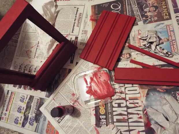 Le di dos o tres capas de pintura. Debo haber preparado lo primero pero fui acometido por vez. El acrílico seca bastante rápido considerando hoy era tan húmedo.
