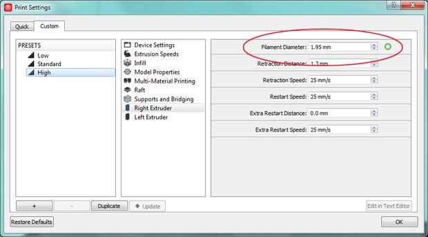 ¿Por qué es esto que sucede? Hay una opción ampliamente ignorada su impresora utiliza para averiguar cuánto plástico es arrojar a chorros hacia fuera cuando empuja a una determinada longitud del filamento a través de la boquilla: el ajuste de diámetro de filamento. Yo siempre había asumido que los filamentos se fabricaron con el diámetro correcto, pero resulta que este no es el caso. Mi impresora utiliza filamento anunciado como de 1,75 mm de diámetro, el valor por defecto en el software es 1,77 m y mi filamento (comprado de MakerBot) es realmente 1,95 mm de diámetro.