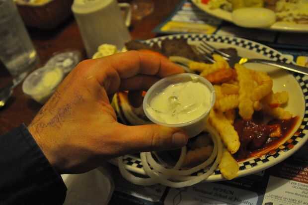 Cuando que la camarera trajo mi sandwich y papas fritas, ya sabía sobre mi experimento cuaresmal. "Por lo tanto, no se que necesitan cualquier salsa de tomate con eso, usted?" dijo, arrebata lejos la botella roja de nuestra tabla. "No gracias", dije, tirando una botella debajo de mi abrigo, "llevé mi propia!"