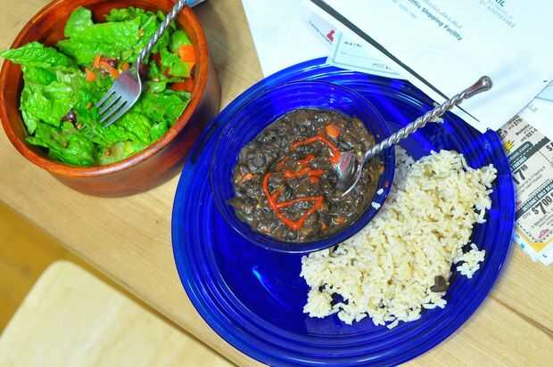 El almuerzo generalmente es restos. Tuvimos algunas lechugas, así que hice una ensalada. La sopa de frijol negro dado vuelta hacia fuera realmente buena. Pero ahora había espesado hasta en la nevera. Bueno, he añadido alguna salsa picante y arroz y decidido era comida cajún. También tuve algunos pan fresco y práctico.