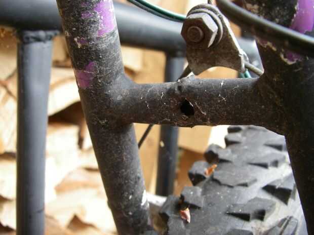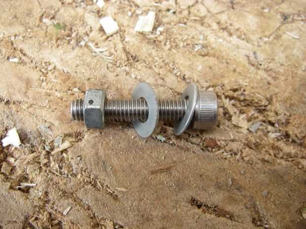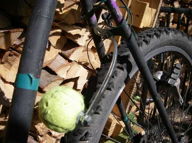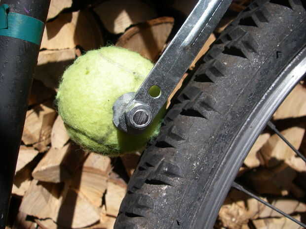 Fijé la Asamblea entera bola a este agujero; el soporte fue doblado previamente para descansar contra la rueda con presión suficiente para girar con la rueda.