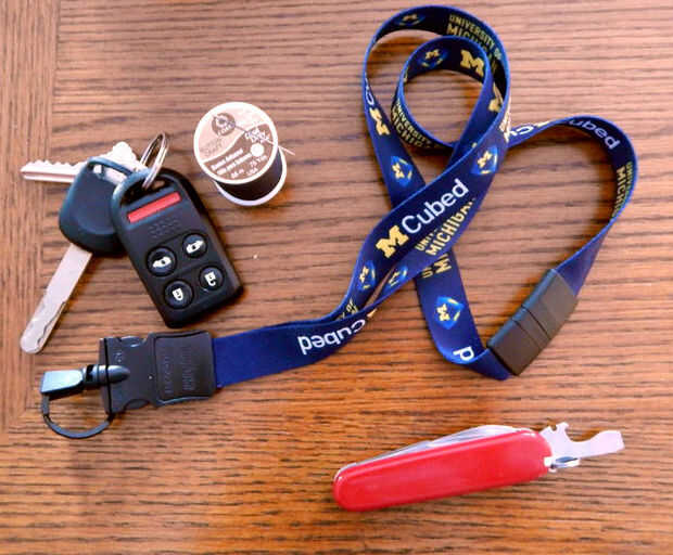 1) una correa con una correa extraíble y un llavero - esta es una conferencia que fui a y aquellos de ustedes que van a una gran cantidad de conferencias saben que hay un montón de ellos alrededor. Mire a su alrededor, compactar, mendigar, pedir prestado, pero no robar! Para este caso particular quería que teclas podrían unir a, pero con un clip podía han trabajado demasiado. También me gustó que este fue atado a una cinta que era más fácil de coser y parece más robusto de eslingas de cadena.