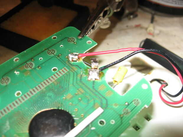 Una vez que sabes donde conectan los cables, es sólo una cuestión de soldadura sobre los cables adecuados. Debe haber suficiente globbed en la placa que no es necesario añadir cualquier extra, sólo calentar para arriba y meter el cable adecuado en cada lado de la soldadura. Asegúrese de que pegan los cables por el agujero de la batería en el caso antes de soldar en.