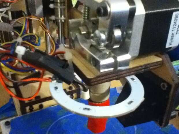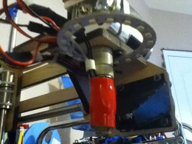 1) gire el anillo para deslizarse entre el ventilador y la extrusora. 2) Utilice una amarra para sostener el anillo en su lugar (no lo hacen demasiado apretado) 3) Conecte los cables para el estirador calentador y sensor de temperatura. 4) de vuelta en el poder y la pluma, tienes luz