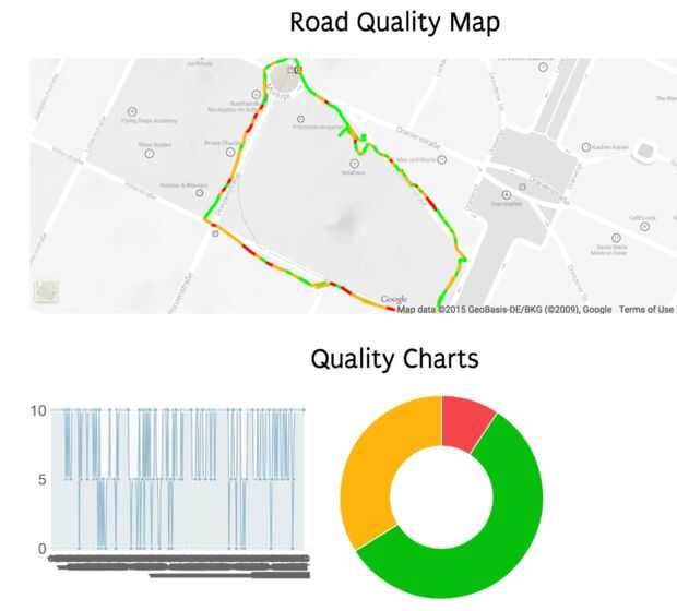 La calidad de la carretera se puede graficar sobre la distancia de recorrido (para detectar segmentos de camino problemático) o en el tiempo (bueno para medir su propio desempeño, especialmente al off-Road). Con el GPS activado, que son capaces de ver el recorrido, con diferentes colores que representan diferencias en la calidad de sufrace. Esto le ayudará a elegir el camino más suave la próxima vez que viaje. Para las pistas de descenso y campo a través, la vibración es a menudo indicativa del nivel de habilidad requerido para un cierto segmento. Compartiendo y viendo rastros de otras personas, usted puede encontrar una mejor para ti y tu moto!