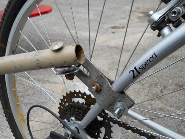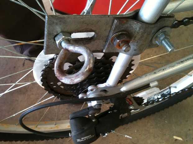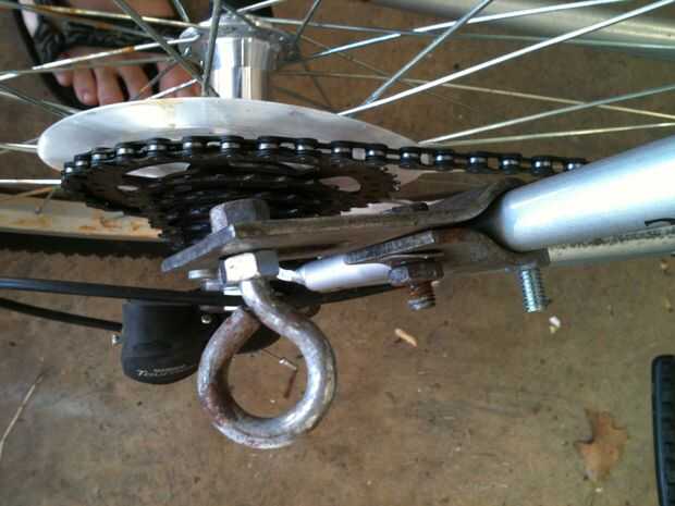 enganches bici son difíciles - normalmente de tornillo en un gancho de ojo en el fotograma donde normalmente le adjunto un bastidor trasero. Si usted tiene un estante adjunto o simplemente quiere algo más fuerte, aquí hay algunas fotos de cómo hice un tensor de cadena motor lo desmontado y lo hizo en un tirón de la bicicleta. Insumos necesarios: stalwarth ojo gancho y tensor de cadena.