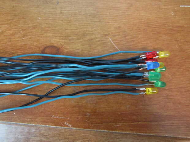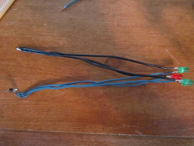 Un LED al final de dos colores diferentes de alambre de la soldadura (por ejemplo, utilicé hilo negro para el cable para el ánodo del cátodo y verde). Luego, separar los LEDs los cables Unidos en grupos de 3.