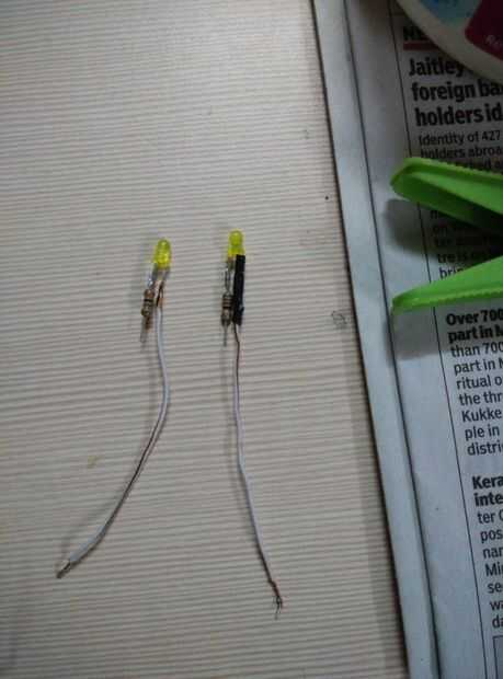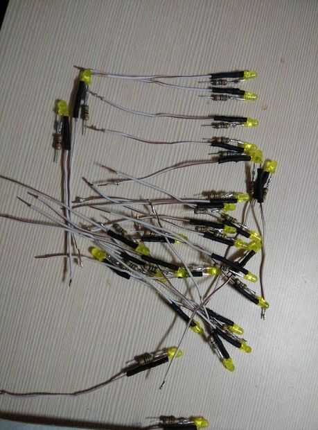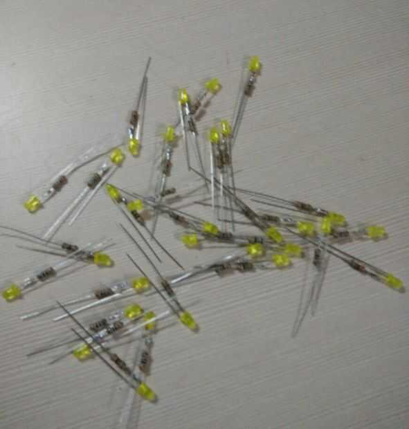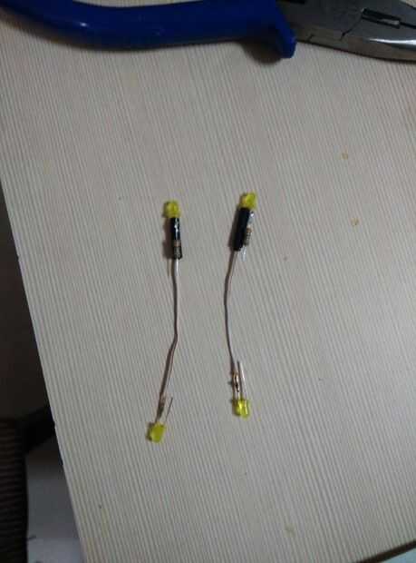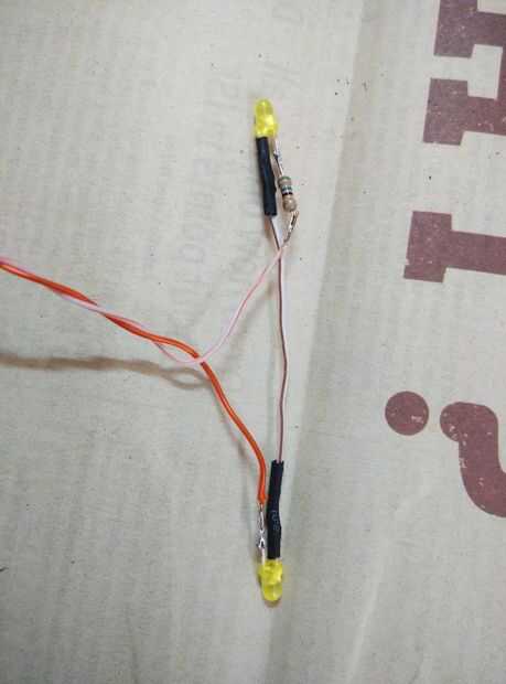 Separar los pares de alambre de un cable cat5e y soldar los LEDs en serie con color en ánodo y blanco en el extremo del cátodo o resistente