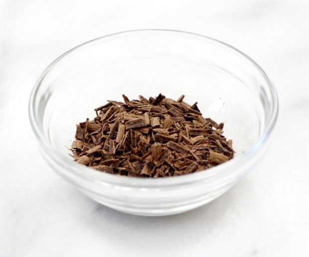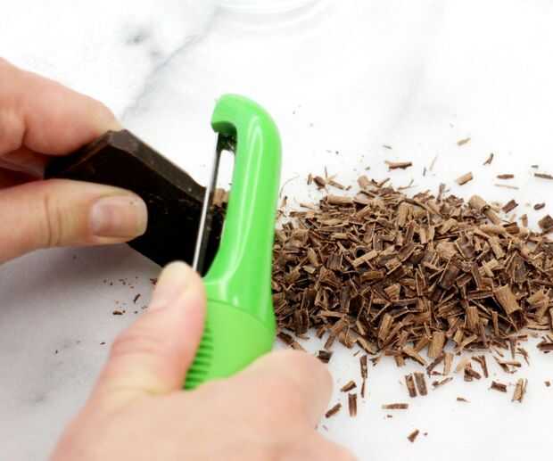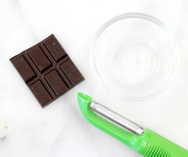 Mientras que la segunda mitad es Chillin ', utilice un pelador para hacer virutas de chocolate y las restantes algunas onzas de chocolate.