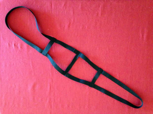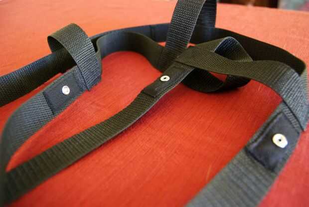 El arnés está hecho de 1" las correas cosidas en forma de bucle largo, con un apoyo cruzado pedazo en el centro y un par de refuerzos más cortos. Un par de broches de presión mantener la correa y el portátil en su lugar. (Yo usé cinta de complemento porque lo tuve y es prácticamente infalible.)