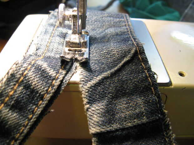 Tenga cuidado alimentar las tiras a través de la máquina para que la aguja está empujando dentro de las costuras de ya presentes en la costura o la cintura. El tejido exterior esta costura será fray lejos rápidamente y tus franjas no mantendrán Unidos.