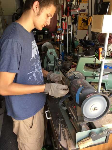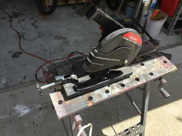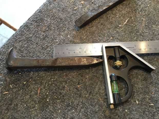 Una vez que hubo terminado, le dejé elegir la longitud que pensó que sería mejor. Él decide quitar de 6cm de la espiga. Tomé uno, le enseñó a Marque la longitud adecuada teniendo en cuenta la anchura de la hoja y la línea de lápiz. Entonces tomé a la tronzadora en la pinza y corte. Después de una breve discusión sobre cómo metal corte cuchillas puede desintegrarse si empuja demasiado duro o les sobrecalentamiento, lo puso delante de la sierra y dijo "hacen la mirada otros tres como esta.