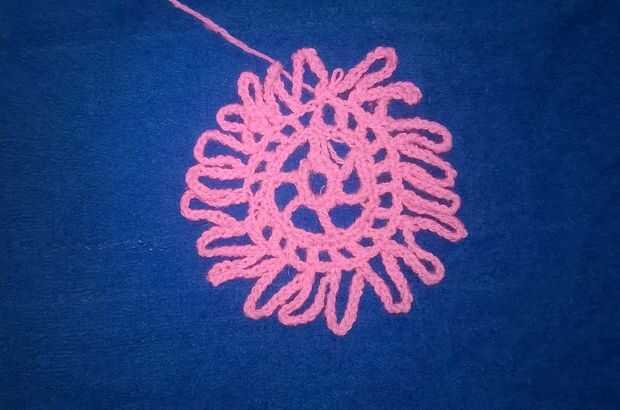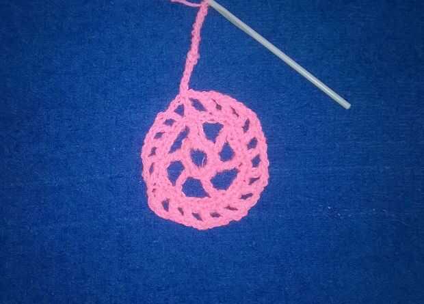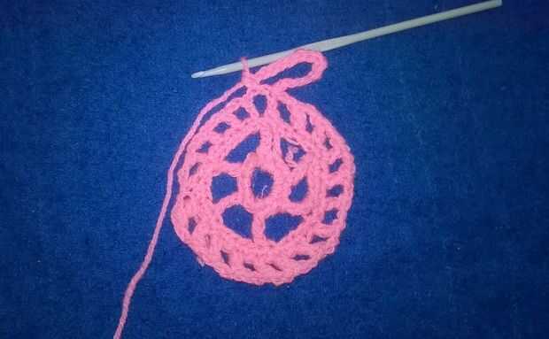6 - la fila * Ch 14 (o) Ch 10. Skip 1 puntada. SC en el siguiente punto * repetir para toda la fila.