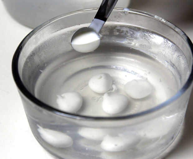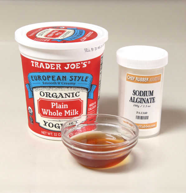 Para las esferas de yogurt necesita preparar a continuación por lo menos 2 horas anticipadamente y dejar que las burbujas de aire se disipe. Las burbujas pueden inhibir la gelificación. El alginato es un extracto de alga marina con propiedades gelificantes de frías y calientes. Está disponible en muchas tiendas de internet