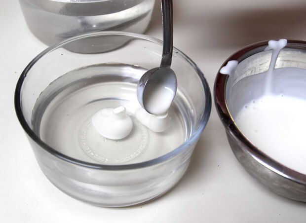 Retire la solución de alginato del refrigerador. Preparar un segundo envase de igual tamaño con agua filtrada. Se necesita una cuchara ranurada o espumadera de malla fina, una cucharadita de medida y una placa para sostener las esferas completadas. Si las ranuras de la cuchara están demasiado grandes la esfera cuelgue a través y rasgue potencialmente para que agujeros más pequeños son mejores.