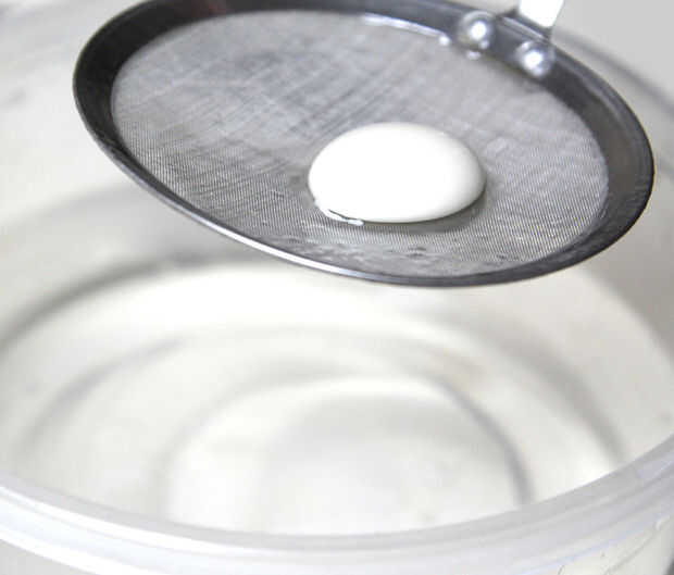 Cucharada de la mezcla de yogur en la cucharilla y drenar cualquier exceso tirando de la parte inferior por el borde del plato. En un solo movimiento fluido caiga el yogurt en la mezcla de alginato. La cuchara sólo debe romper la superficie del líquido. Hacerlo muy lentamente con el resultado en las esferas con cola en vez de ser redondo. Esto toma algo de práctica para no desalentar si ellos no son perfectos! Al principio es más fácil hacer una esfera en un tiempo pero es posible crear múltiples esferas en el mismo recipiente. Sólo tenga cuidado para evitar que las esferas toquen o se pegan y luego romper al intentar separarlos.
