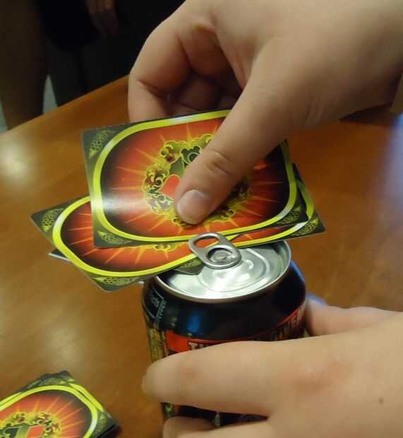 Después de que el jugador ha revelado la tarjeta y todo el mundo ha respondido a la regla asociada, la tarjeta se volvió. La forma correcta de enviar una tarjeta es introduciendo cuidadosamente en la pestaña de la lata de cerveza. Como los jugadores seguir tomando turnos, tarjetas se acumulan en la pestaña de la lata. El juego llegará a su fin cuando un jugador vuelve una tarjeta y que salte la ficha en la lata, o si cualquier jugador toca tarjetas en la parte superior de la lata. El desafortunado jugador que aparece en la ficha o golpea las cartas entonces debe bebiendo la cerveza.
