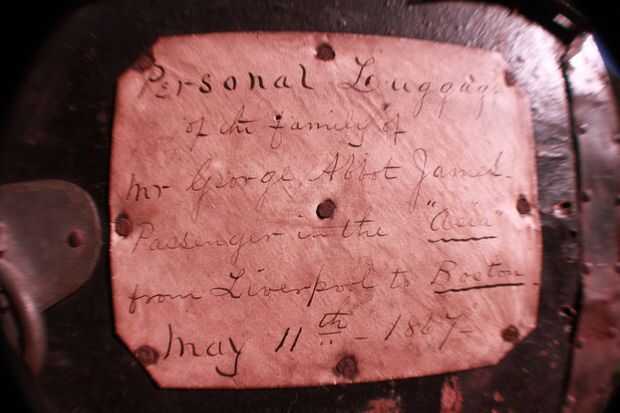Este tronco contenía pertenencias de la familia de George Abbot James cuando su familia viajó de Londres a Boston en 1867 en un barco llamado "Asia". Hubo ensobrado viejo atado a la parte posterior del tronco con la escritura diciendo que. El "Asia" hizo muchos pasajes transatlánticos en las familias del siglo XIX que busca una nueva vida en América. Puedes ver este sobre en las fotos que adjunto. La dotación ha sido enmarcada y conservados.