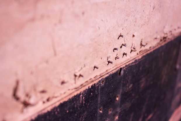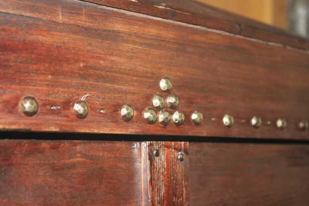 Las clavijas originales alrededor de la tapa del tronco eran muy frágiles. Lamentablemente, una vez más, tuve que ir al plan B. Quité las cabezas de alfiler y luego los pernos porque estaban tan flojas. Arena sobre los agujeros de la vieja y me compró a los nuevos pernos de tapicería para que coincida con los existentes.
