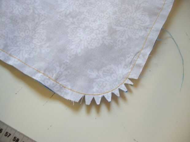 Cortar triángulos de la curva y girar el delantal con el lado derecho de la tela hacia el exterior.