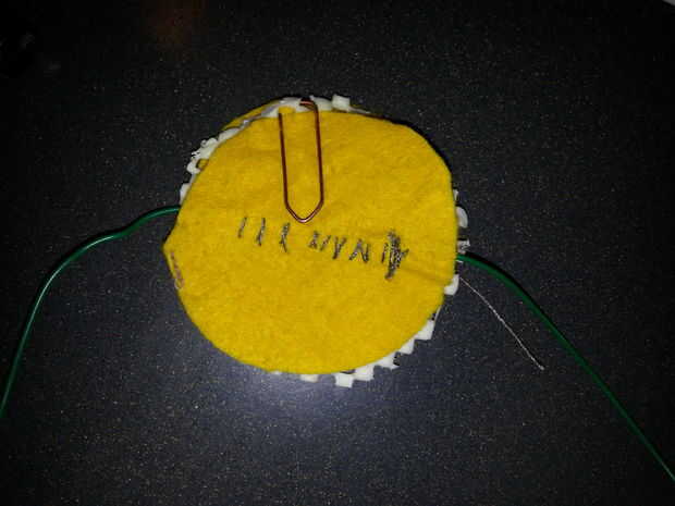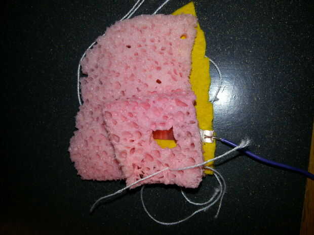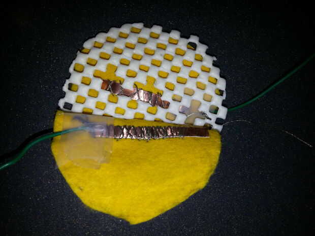Cuando creas un botón Inicio con el corte de dos piezas de tela y luego colocar metal o coser con hilo conductor de cada pieza de tela. Asegúrese de que utilizar suficiente cantidad de hilo de metal o conductor.