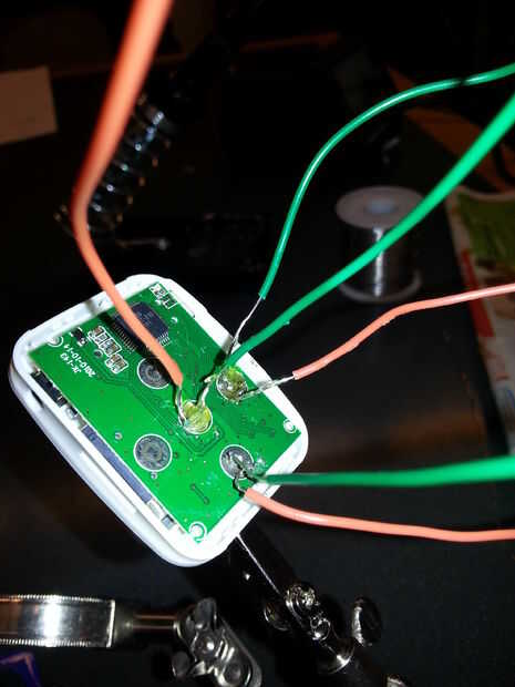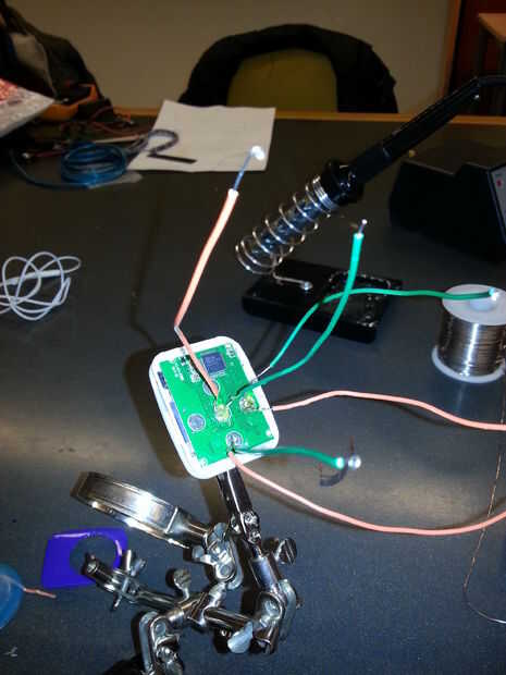 Entonces se deben soldar un cable al círculo y uno en el círculo exterior. La soldadura es difícil y a menudo es más fácil tener cuatro juegos y las manos en lugar de dos. Una persona puede tener algún tipo de metal, como un destornillador para crear un muro entre los dos círculos durante la soldadura. Es muy importante que no se conectan los dos cables que se sueldan, porque si los dos círculos están conectados la función no funcionará.