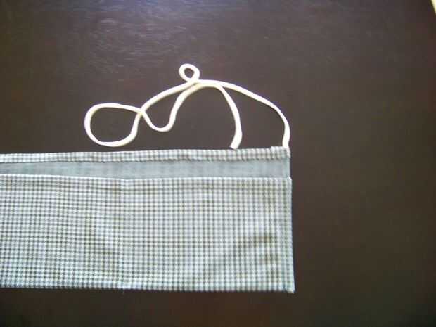 Tomar el material que ha elegido para los vínculos de su delantal y una tira del hilo de rosca, aproximadamente una yarda de longitud (si está usando un lazo de la camiseta, a cortarlo en dos trozos), a través de cada pequeño bolsillo creado por coser sus pliegues laterales en el paso 5 (ver imagen). Si tienes un enhebrador de lazo, esta es la oportunidad perfecta para usarlo. Si no tienes un enhebrador, sujete un imperdible a un extremo de la corbata y trabajarlo poco a poco a través de la bolsa. Asegúrese de que el empate recorre desde la parte inferior hasta la parte superior el pequeño bolsillo para que el exceso recorre la parte superior del delantal.