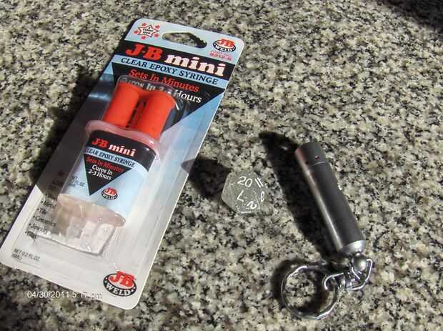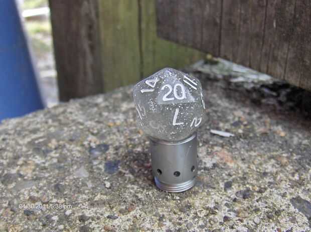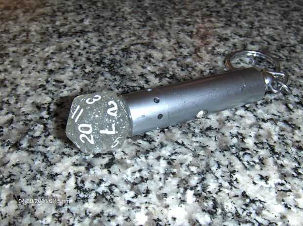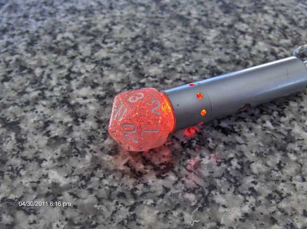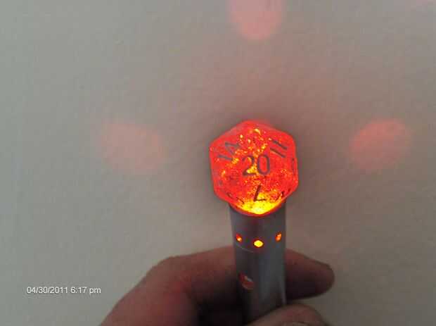 - Primero encontrar un dado echado a un lado 20 que es translúcido. Primero trataron de perforación hacia fuera de un colorante opaco y brilla una luz en el agujero pero no pudo hacer el tinte del resplandor.
