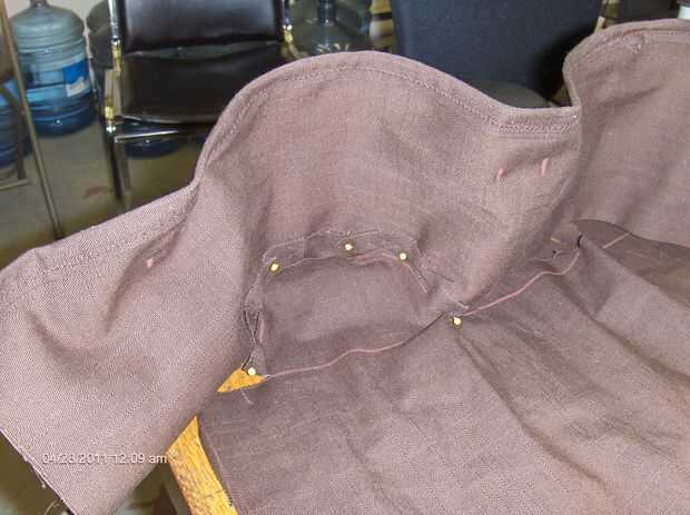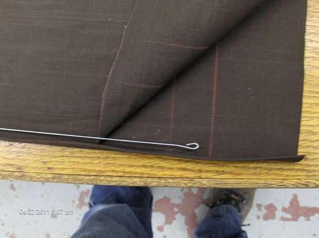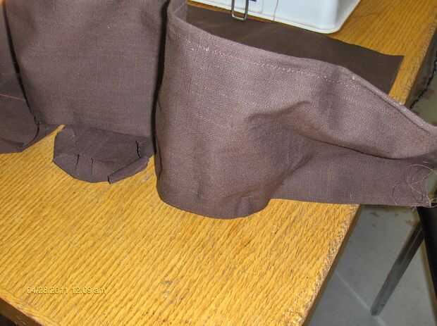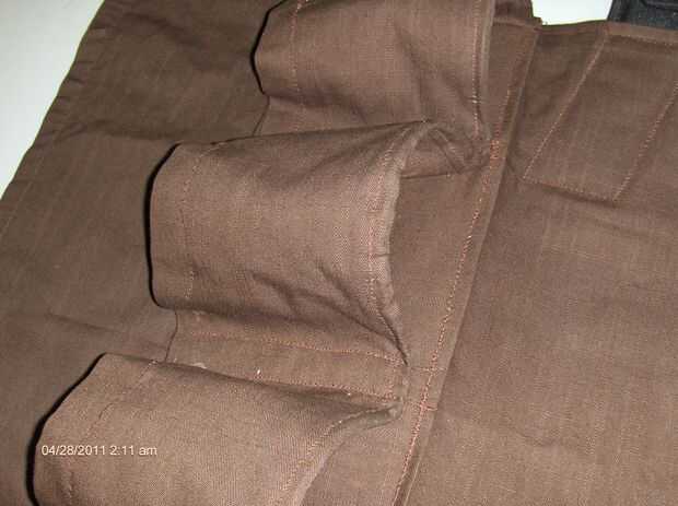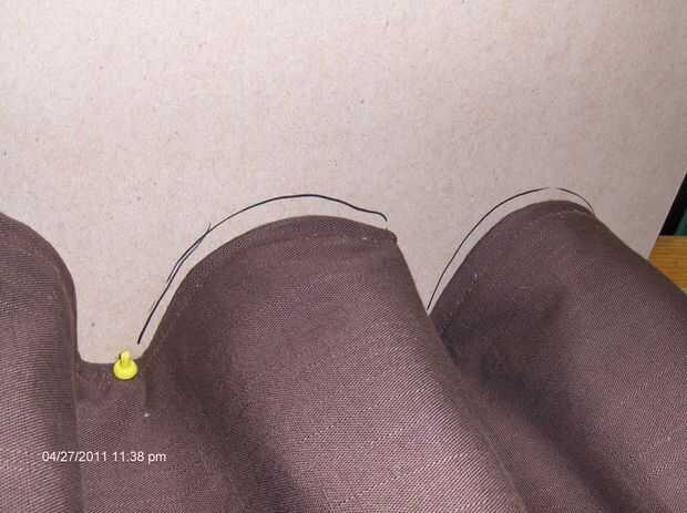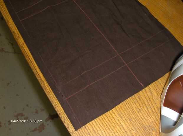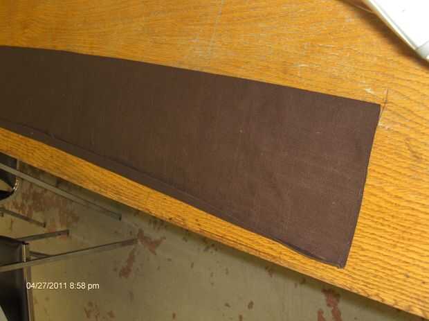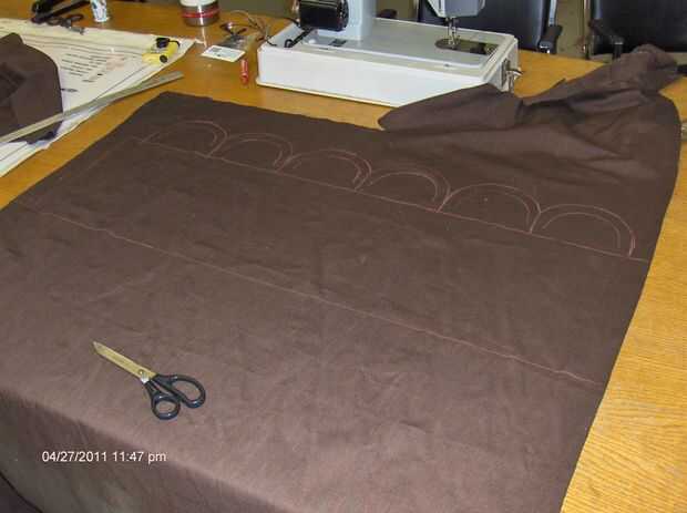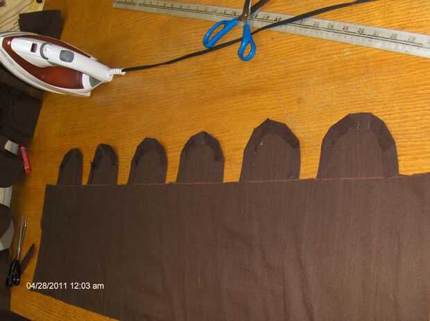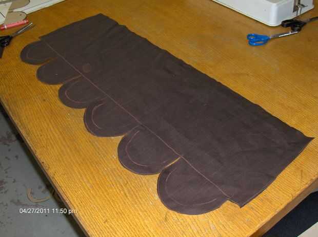 - Los fondos son algo adlib, que dependiendo de cómo hacen sus bolsillos el patrón variará. Esto viró a mi superficie de trabajo y coloque un pedazo de cartulina detrás de los lazos y les trazó. Este trazado fue cortada y trazada en otra sección del material, aproximadamente 26" por 18". Ver las fotos para tener una idea de las dimensiones. Entonces agregué aproximadamente 1 pulgada de la costura a la salida de la curva lateral, que tenía las costuras curadas raja cada pulgada para permitir la fácil doblado más adelante. Luego se corta el pedazo entero. El lado no curvy tiene 1 pulgada de material doblado sobre sí mismo dos veces y planchada plana. Esto luego se dobla sobre sí mismo de 5 pulgadas. Esto da una sección de 6 pulgadas a los bordes planos de las formas de herradura.