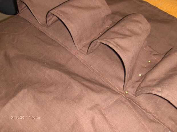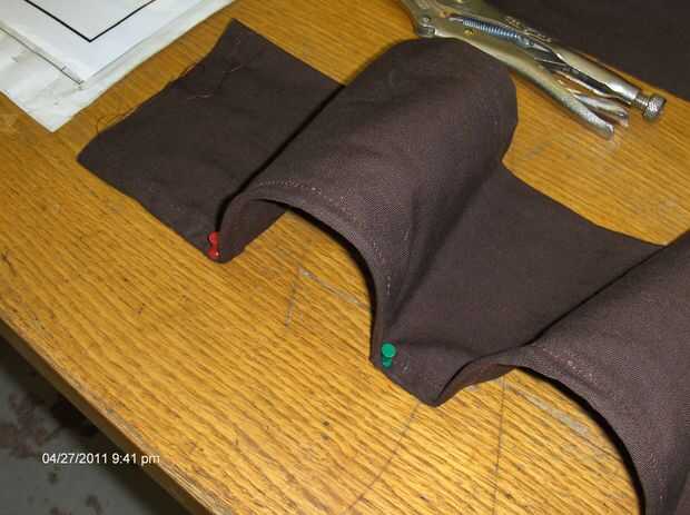 - Ahora comienza el verdadero infierno, haciendo 1 bolsillo a la vez, se alinean las aletas pequeñas de la base con el interior de las curvas de los bolsillos exteriores, pin en lugar y hacen su mejor coser juntos. Pasar a la siguiente bolsa y continuar 3 veces más. Todo este proceso habría sido mucho más fácil si cosido a mano, en lugar de la máquina. Pero, infierno doblado sobre el uso de la máquina de coser.