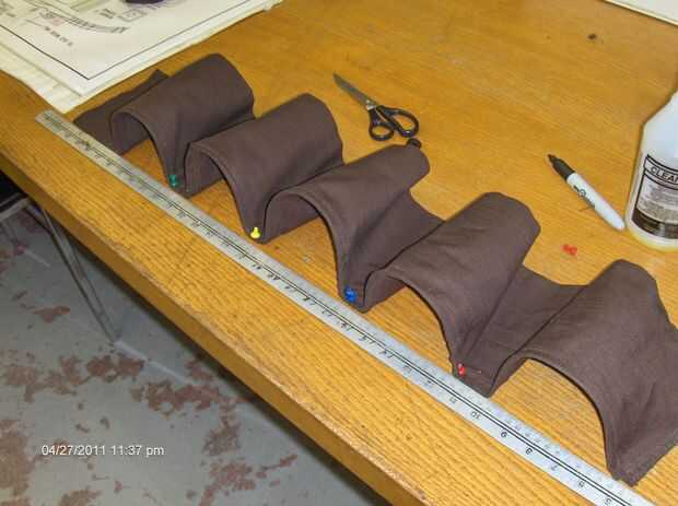 - Basado en los cuatro 9" bolsillos para contener una gran variedad de botellas de aerosol; el espacio de 2 pulgadas entre ellas consigue comido un poco con la costura que da cerca de 1 pulgada entre cada bolsillo. Esto le da suficiente espacio para coser con la máquina de coser. Comenzando en un extremo, la cuenta de 5 pulgadas y luego doble una sección en forma de herradura con un radio de 9 pulgadas. Espacio de 2 pulgadas luego realizar otra herradura repetir su hasta usted tiene 4 herraduras terminando con otra de 5 pulgadas.