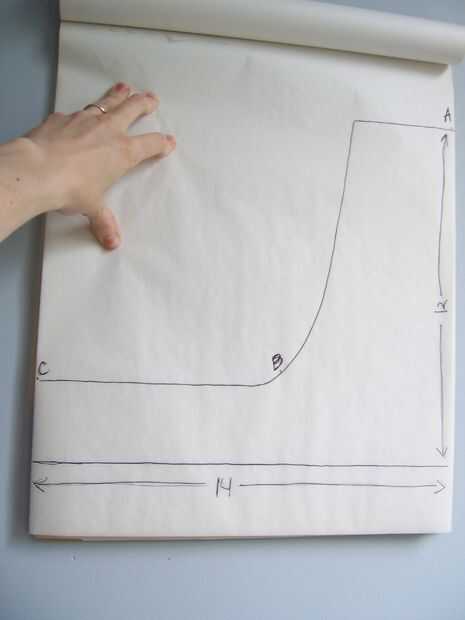 En un pedazo de papel grande (o papel de kraft o sacos de papel abiertos corte de abarrotes), dibuje un enlace 14 pulgadas de largo. En un extremo de esta línea, dibujar un perpendicular de 12 pulgadas de línea hacia arriba. En la parte superior de la línea de 12 pulgadas (punto A), dibuje una línea de 4 pulgadas paralelo a la línea de 14 pulgadas. Marque un punto 2 pulgadas sobre el principio de la línea de 14 pulgadas, este es el punto C. Del punto C, trace una línea larga de 8 pulgadas que es paralela a la línea de 14 pulgadas. Dibujar una curva suave que conecta la línea de 8 pulgadas y la línea de 4 pulgadas. Corte el patrón. Coloque la línea de 12 pulgadas en el doblez del centro de la tela y cortar su babero.