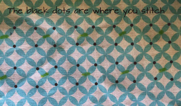 Se puede utilizar cualquier material. Pero usted tendrá que marcar el material para hacer los cuadrados. Así que decidí encontraría material con un diseño así que no tengo que hacer un montón de marcas. Todavía tenía que marcar las casillas porque es difícil saber dónde hacer las puntadas como vas. El verde muestra que caja de puntada. Aquí está el material que elegí y marqué las zonas con puntos negros donde coser en esta pieza de muestra. Quería ver donde coser. Para este vestido compré 2 yardas porque se necesita material extra por el fumador. También compré 1 1/2 yardas de material blanco para el vestido. Y un bolso de perlas para añadir a cada puntada. Tomé unos 250 para este vestido.