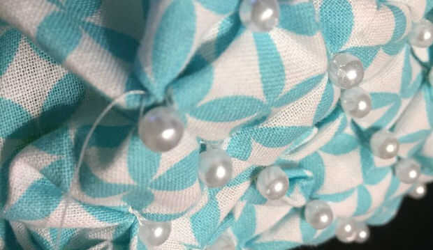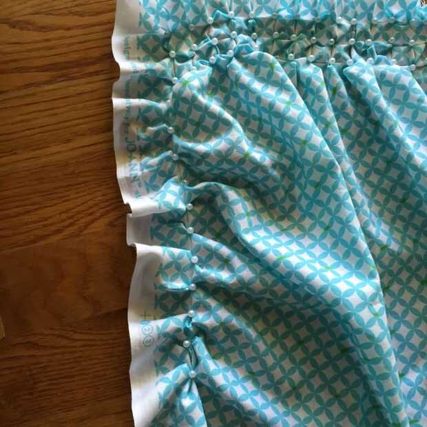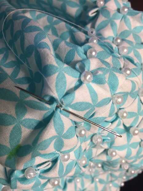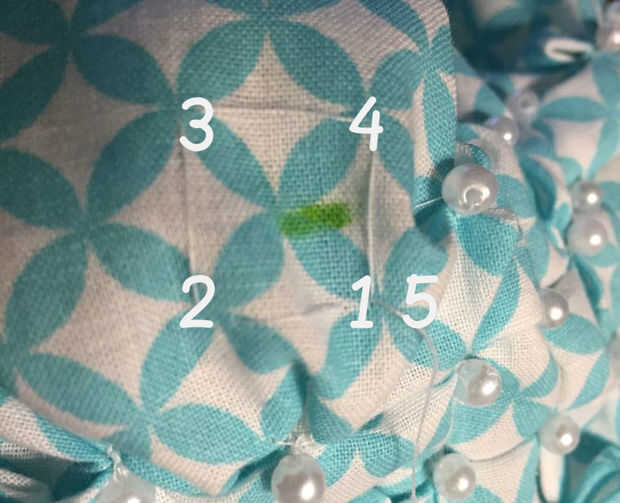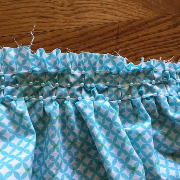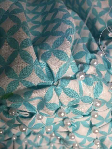 Utilicé material que tenía un diseño que trabajó en vez de poner todos los puntos. Pero aún seguí el tutorial con haciendo 5 puntos de sutura y luego tirando una puntada para apretar. Hacer una puntada para unir el diseño y luego poner una perla. He añadido otra puntada para mantener la perla extra apretado. Aquí le damos un dibujo por lo que es un poco más claro lo que parece la puntada. Una vez que lo pruebes verás lo fácil que es hacerlo. Asegúrese de que marcar todo el material. Asegúrese también de material es recta. Comencé en un extremo y pensé que tenía espacio en la parte superior pero el material no era recta y perdido una fila de smocking.