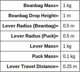 Antes de empezar a hacer cálculos vamos a necesitar alguna información sobre la fuerza vamos a utilizar para lanzar el disco. En lugar de golpear la palanca con un martillo, dejará caer una pelotita en la palanca. La pelotita tendrá una masa de 1 kilogramo y se quitarán en la palanca de un metro de altura. La palanca será exactamente un metro de largo, con el fulcro situado en el centro. El disco tiene una masa de 0,1 kg, y la palanca tiene una masa de 1 kilogramo.