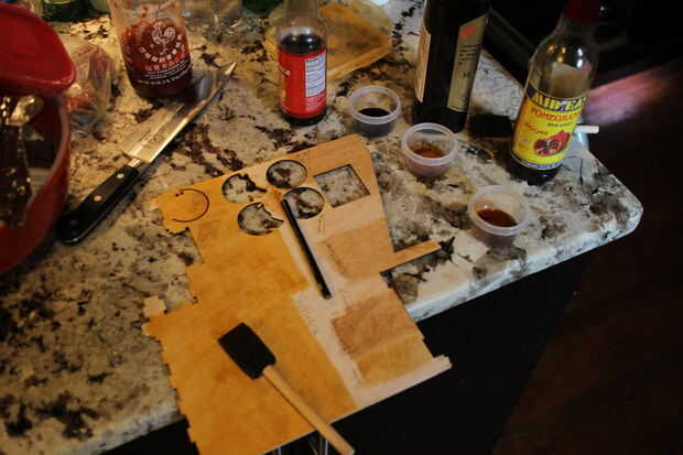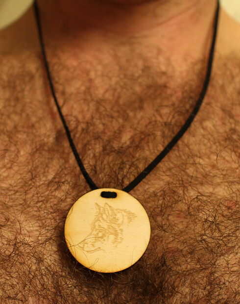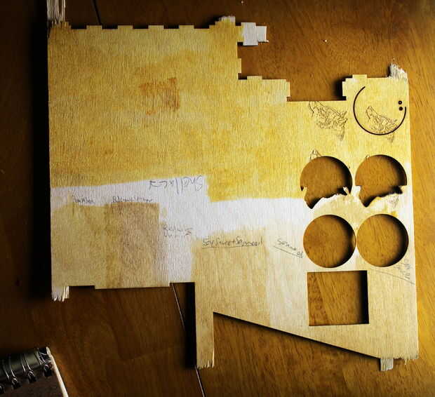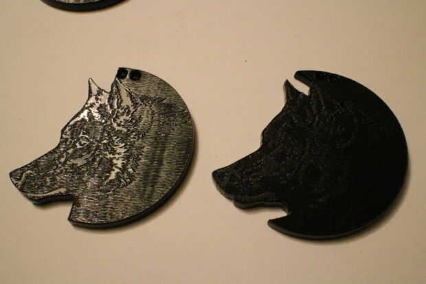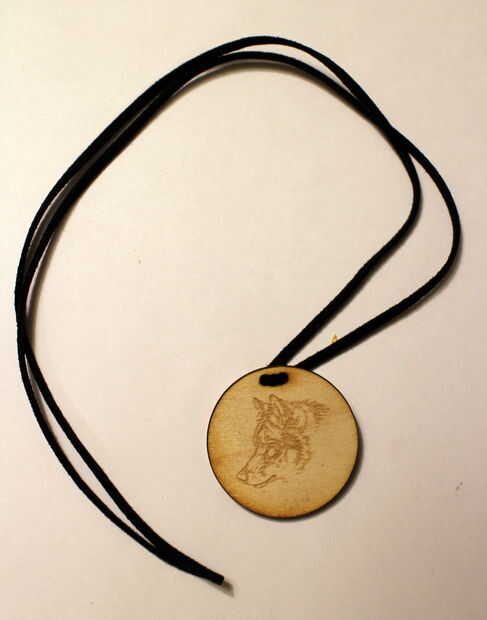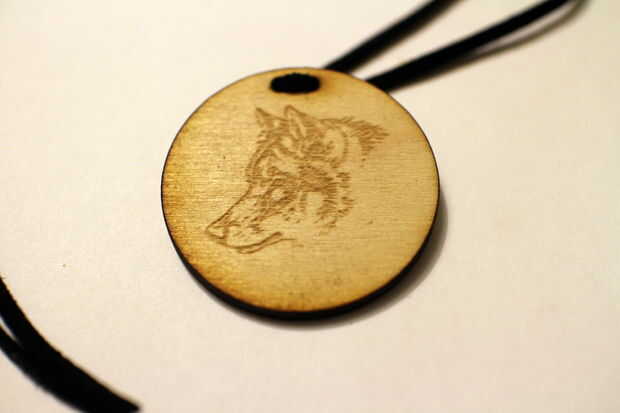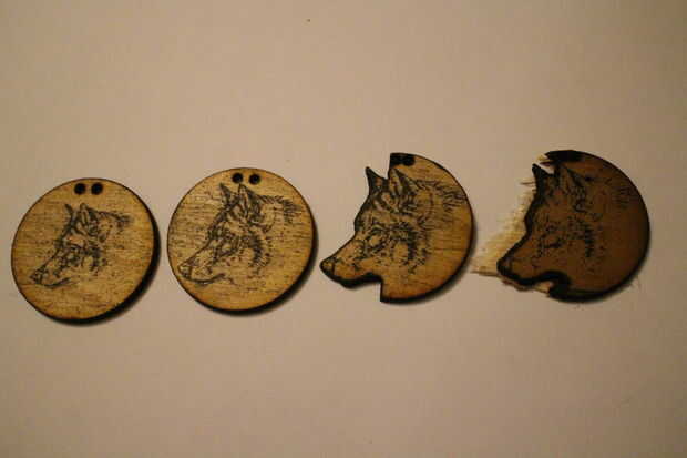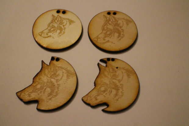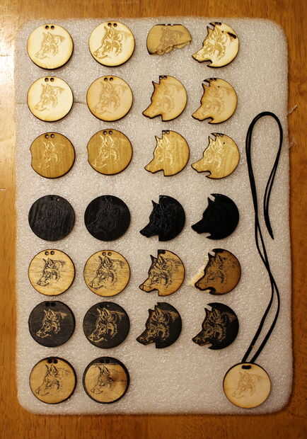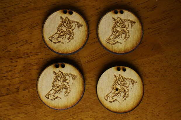 Hemos probado varias iteraciones de los diseños para los medallones, con respecto a la forma, tipo de madera, tamaños de agujeros, frontera tamaños, niveles de potencia. También probamos muchas técnicas para la cara de lobo en la parte delantera de la proyección de imagen. He probado varias formas diferentes de coloración de la madera (pintura en aerosol, vinagre balsámico, lana de acero y vineger) para aumentar el contraste con la parte delantera. Finalmente entramos con un grabado natural crudo de 1/8 de pulgada abedul o madera contrachapada. Esta iteración es muy importante, porque va a pasar todo tipo de cosas inesperadas con el cortador del laser. Esto será especialmente cierto cuando se crea algo en grandes cantidades.