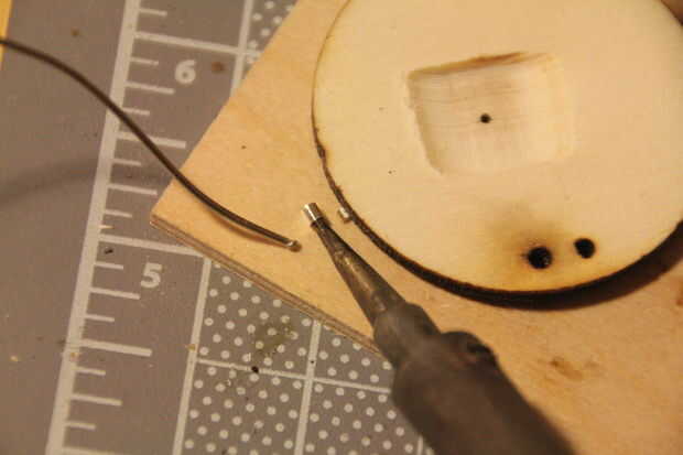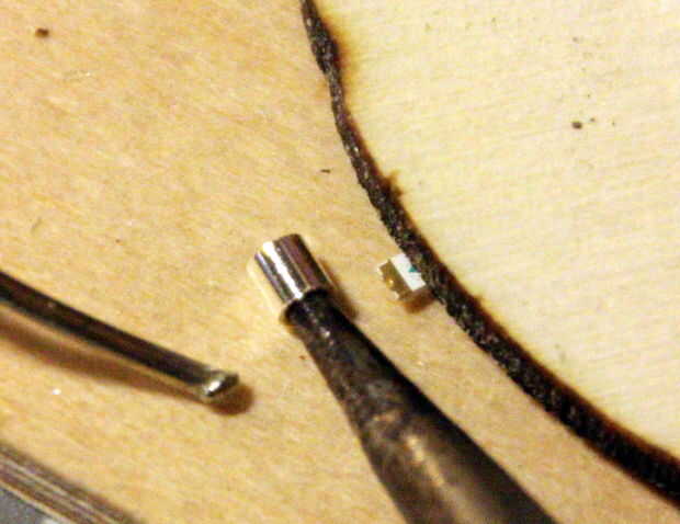 En primer lugar establecer uno de los medallones en la parte superior de la mitad de lo LED. Esto mantenerlo cargado abajo, en el lugar y evitar que la soldadura penetre en el lado no deseado. Luego llevé el tubo de presión en el soldador hasta un poco empastadas de soldadura en y presto! La mitad de su grano es completa. Para la otra mitad, colgadas un montón de los granos de la mitad en un trozo de soldadura y me fui abajo de la línea añadiendo cuentas a los lados. Funcionó bien!
