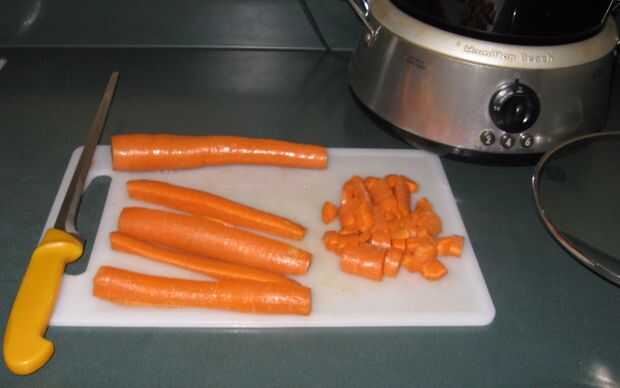 A continuación, quitar cualquier piezas malas y cuarto la longitud zanahorias sabia, después cuartear las zanahorias cortarlas en mordida pequeños y añadirlos a la olla.
