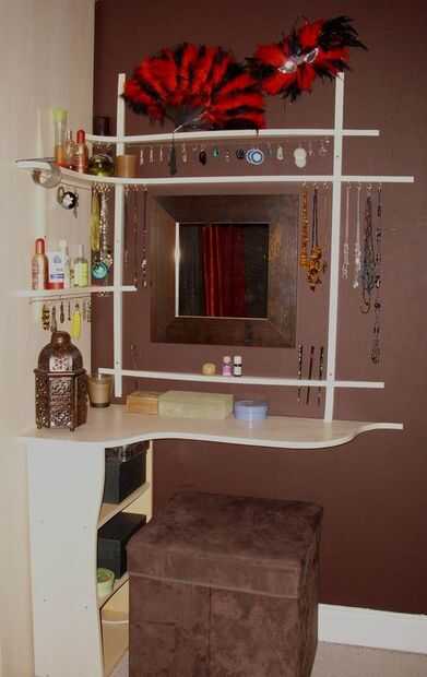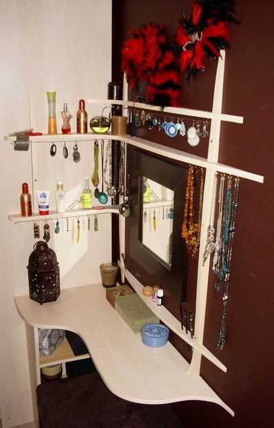 Estábamos realmente infelices con todas las tablas de preparación que se pueden comprar en las tiendas - pierden completamente el punto de lo que necesita un tocador. En primer lugar, un tocador necesita dar cabida a montones y montones de cosas muy pequeñas y sólo que algunos grandes cajones no - es decir, tratar de encontrar algo ahí! En segundo lugar, deben ser las cosas en orden, repito, los cajones son sin esperanza. En tercer lugar - todos esta joyas y perfume basta con mirar brillante, así que ¿por qué ocultarlos en cajones o cajas en lugar de mostrarlos? Finalmente, debe ser cómodo para sentarse y en este caso significa que usted debe poder inclinarse cerca del espejo colgando en el otro lado de la tabla como sea posible - que quiere decir que la mesa no puede ser tan amplia como lo es en mayoría tablas de preparación de la venta por menor. Teniendo todo esto en cuenta y unirse a mi preferencia por elegantes curvas que surgió esta hermosa pieza de mobiliario.