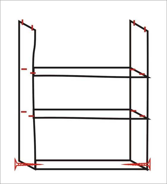Montaje de la parte inferior no debería ser un problema. Siempre es mejor usar como tornillos poco posible ya que no ven muy bien - en este caso usted sólo puede utilizar para unir los lados con el estante inferior, y ya que va estar acostado sobre el lado de un tornillo de tierra debería ser suficiente. Ahora Conecte los otros dos estantes usando clavijas, cuatro cada uno. Por último, poner cuatro clavijas en la parte superior de la plataforma que se unan a la mesa.