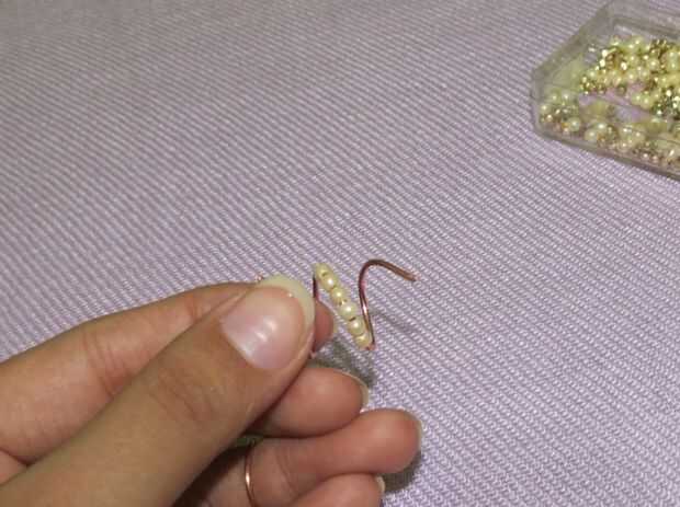 Segundo anillo, pasé a través de 6 pequeñas perlas y asegura los extremos con el mismo truco que hice en el primer anillo.