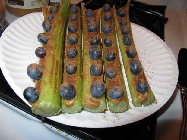 Tuvimos un apio en la nevera que fue un poco triste :-(Pero quería comer algunos apio + mantequilla de cacahuete, y no puede extender mantequilla de maní en un tallo de apio droopy!Laura tuvo una gran idea: pegar los tallos de apio en un vaso de agua