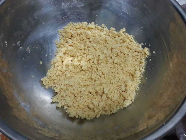 3. Frote mantequilla en la harina y el polvo de hornear hasta que la mezcla se ve como pan rallado.